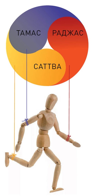 Люди, а точнее состояние их ума, значит, и все, что создается их деятельностью, также подчинены действию этих гун. Образ жизни, внутренний мир человека, вкусы, предпочтения, одежда, пища, методы и стиль ведения бизнеса, дружеское окружение — все определено качествами гун.